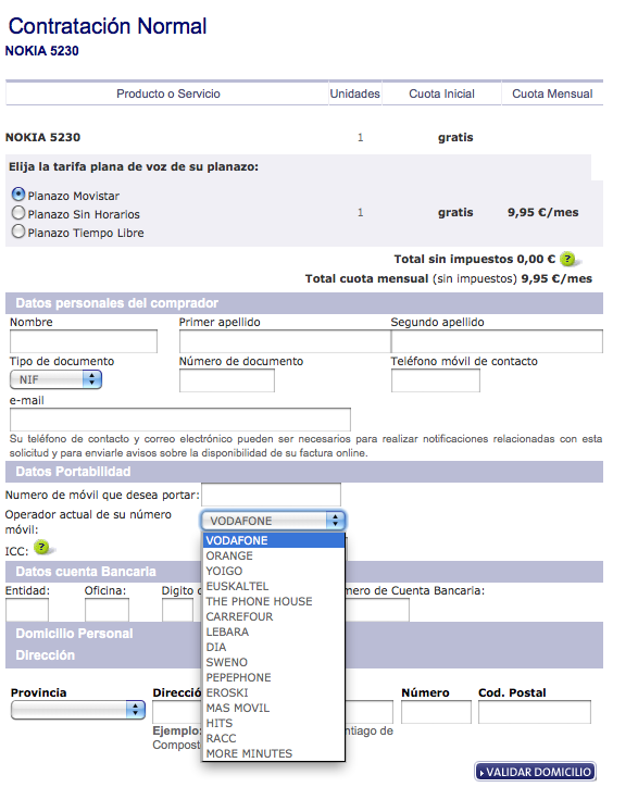 Hemos accedido a tres ofertas de Movistar, pinchando en varios enlaces de creativides publicitarias vistos en internet. Todos invitan a contratar un terminal realizando una portabilidad. Llegados al formulario de portabilidad, la incongruencia de operadoras que aparece en unos y otras es desconcertante.